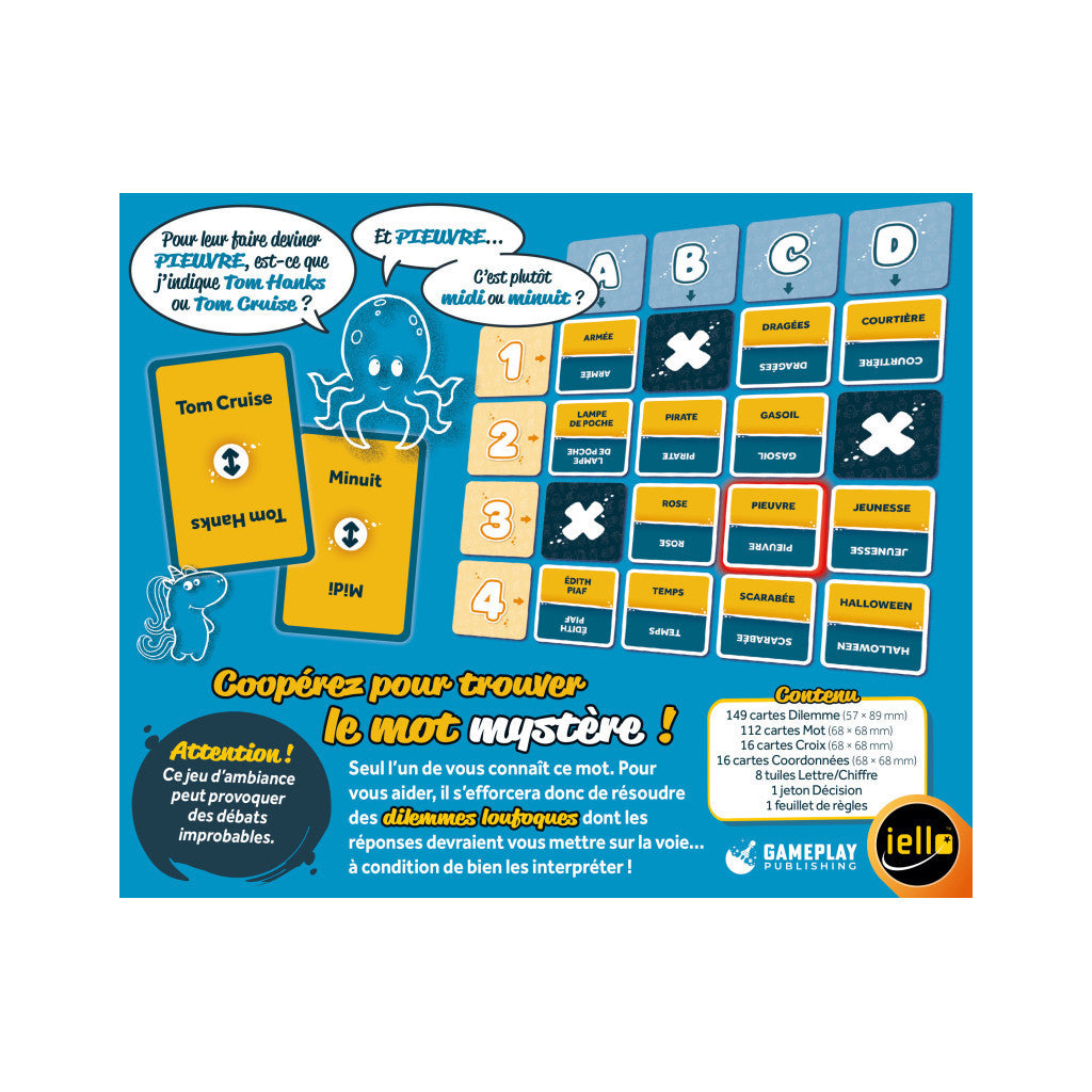 - Mélangez les cartes « Dilemme », les cartes « Coordonnées » et les cartes « Mot » selon la règle.