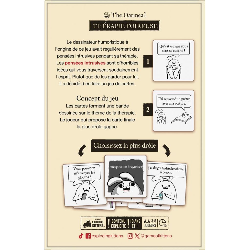Conçu par The Oatmeal (le célèbre auteur de BD) et les créateurs d’Exploding Kittens, Thérapie Foireuse est un jeu à l’humour noir délibérément trash, réservé aux adultes. Avec plus de 400 cartes, chaque partie est unique. Âmes sensibles s’abstenir ! Les autres s’amuseront… comme des petits fous !